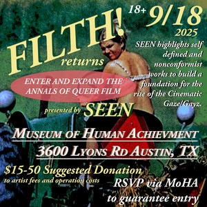 FILTH! First premiered in Chicago in 2023 as a 4 part series. Reel 1 came to Austin in May 2025, marking SEEN’s Texas debut. This fall we bring you reels 2-4 with one screening each month! Join us Sep 18, Oct 18, Nov 20, as we enter and expand the annals of queer film with our friends at MoHA!
