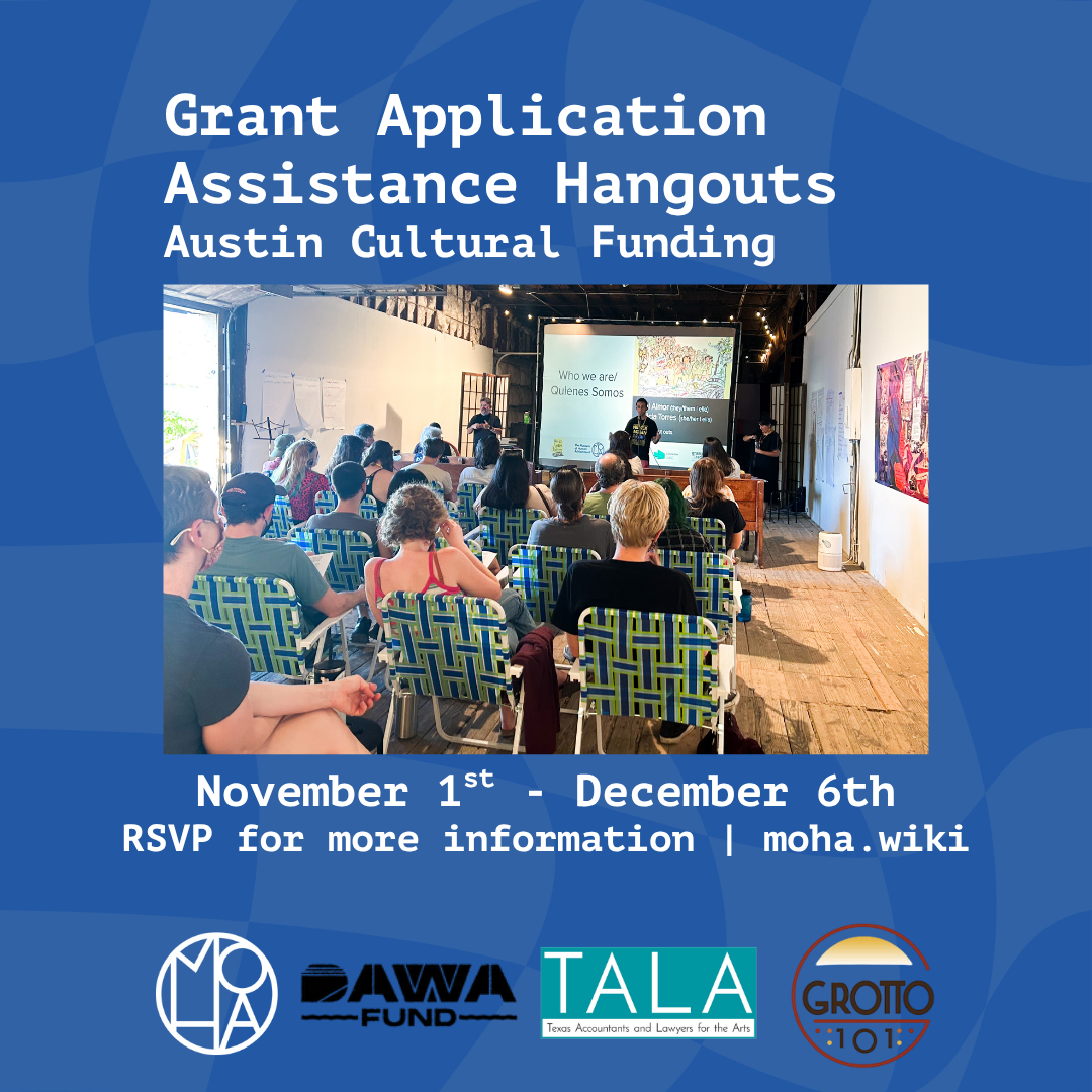 General graphic for the Grant Application Assistance Hangouts - Austin Cultural Funding 2025 that MoHA is hosting.