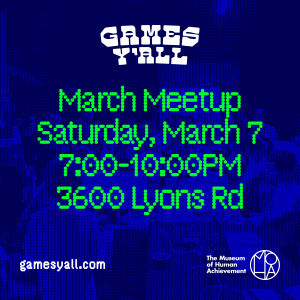 Games Y'all returns to The Museum of Human Achievement on Saturday, March 7th from 7:00-10:00pm for our March meetup.