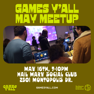 Join Games Y'all on Saturday, May 16th at 7:00pm at the Hail Mary Social Club on Montopolis. Enjoy some never-before-seen games, weird art, and community with us before the summer truly gets going.
