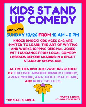 Knock knock! Kids ages 6-12 are invited to learn the art of writing and workshopping original jokes with guidance from local comedy legends before sharing in a short stand up showcase. Activities and joke-writing led by: Excused Absence Improv Comedy, Avery Moore, Aira Juliet, Mac Blake, and Roxy Castillo.